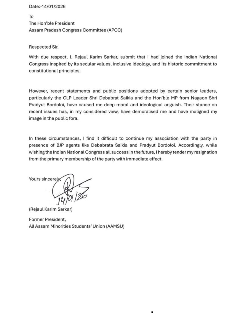 কংগ্ৰেছত যোগদানৰ দুদিন পিছতেই আজি ৰেজাউল কৰিম সৰকাৰৰ কংগ্ৰেছ দল ত্যাগ ‘জাতিতকৈ দল বা ব্যক্তি ডাঙৰ নহয়’ কংগ্ৰেছ এৰিয়েই মহাবিস্ফোৰণ