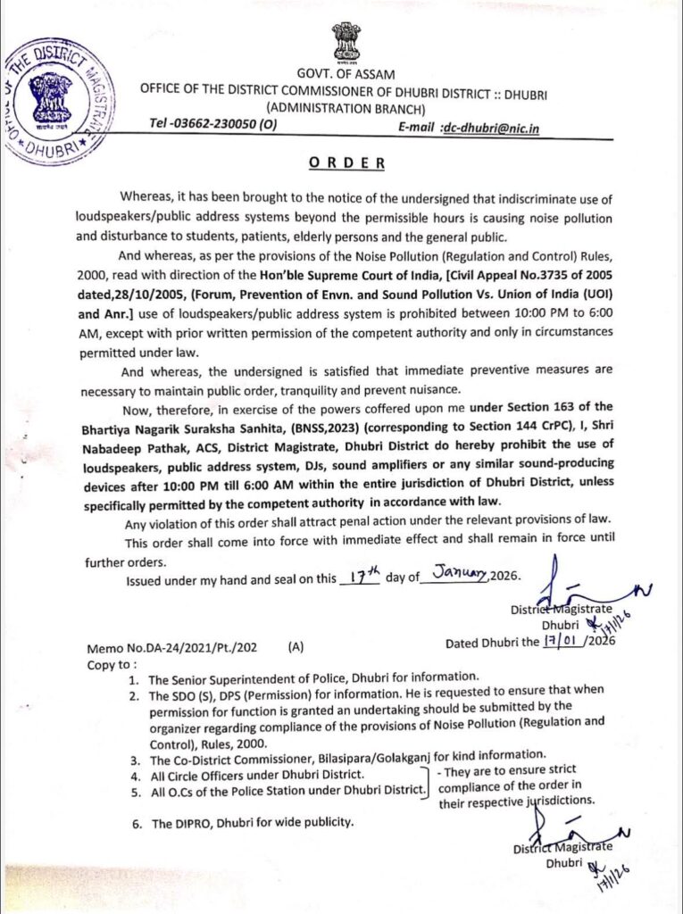 হঠাৎ ধুবুৰীত জাৰি BNSSৰ ১৬৩ধাৰা অনিৰ্দিষ্টকাললৈ প্ৰযোজ্য হ’ব কঠোৰ নিয়ম ধুবুৰী জিলা আয়ুক্তই জাৰি কৰিলে এই নিৰ্দেশনা কোনেও বজাব নোৱাৰিব