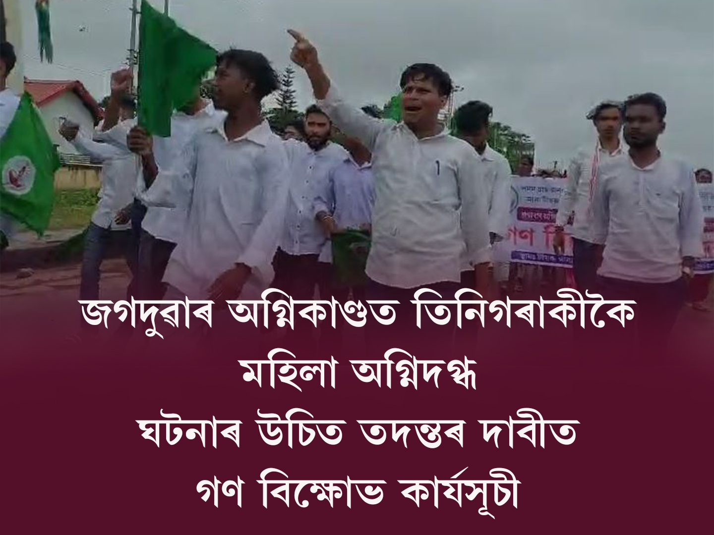 জগদুৱাৰৰ অগ্নিকাণ্ডত তিনিগৰাকীকৈ মহিলা অগ্নিদগ্ধ হোৱা ঘটনাৰ উচিত তদন্তৰ দাবীত গণ বিক্ষোভ কাৰ্যসুচী ৰূপায়ন কৰা হয়।